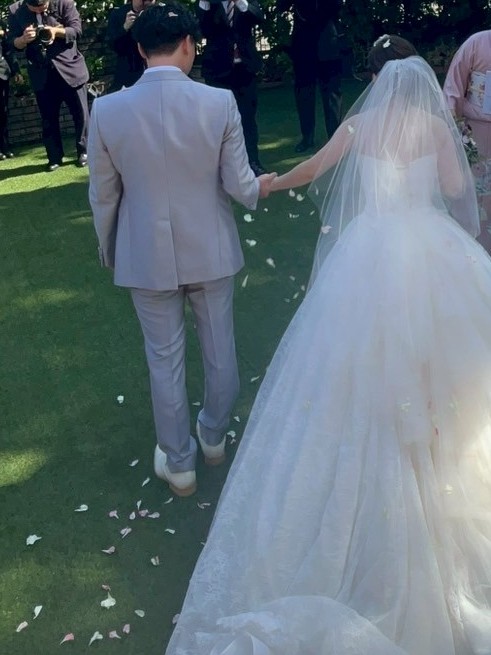 外で待ち構える私たちの前に新郎新婦が登場。