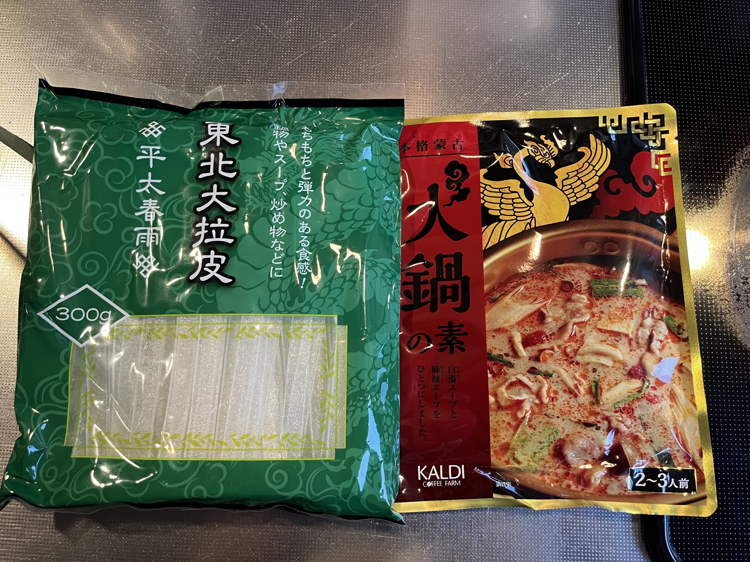 まずはカルディで火鍋の素を調達し、業務用スーパーでタンミョンと言われる太い春雨を購入します
